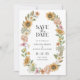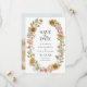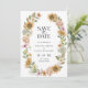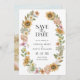 Foto de girassol Salve o Cartão de Data. Esta salvação moderna apresenta uma impressionante cor d'água rosa e flores poeirentas, cor-de-rosa-d'água, lindos girassóis amarelos, e verde-sábio organizado como uma coroa adorável que é perfeita para aqueles que amam o feiticeiro/elegância boêmica. Encontre itens correspondentes na Coleção de Casamento de Girassol Moderno.