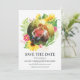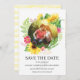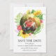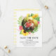 Uma bela coroa de girassol com pop de flores cor-de-rosa acentos e quadros verdes, você salva a foto de data. Adicione seus detalhes e fotos. A parte traseira da placa é decorada com listras de aquarela amarelas claras.