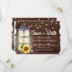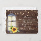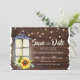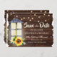 Rustic Wedding Save the Date retrata um girassol amarelo floral e verde com luzes de cordas e uma lanterna sobre uma madeira escura com bordas escaldadas de fundo. As costas mostram a citação inspiradora cristã, "Duas vidas unidas em amizade, Dois amigos unidos em amor, Um amor unido em Cristo." Perfeito para os casamentos de verão e outono.*