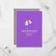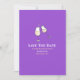Um cartão simples e minimalista de "salve a data" tem uma ilustração desenhada à mão de duas taças de champanhe inclinadas uma em direção à outra em cor de pêssego pastel delineada com cinza. Elas estão colocadas contra um fundo violeta roxo e têm espaços para a sua mensagem personalizada em branco e laranja pêssego abaixo delas. O fundo cinza no verso tem um espaço para informações adicionais, se necessário. São ideais para anúncios de casamentos hetero e LGBTQ+.