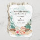 Cartão de Save the Date inspirado em ilhas apresenta um arranjo de hibiscos, flores de jasmim e flamingo, e folhas de palmeira com um fundo de lavagem de aquarela azul aqua. O verso é uma folha de palmeira leque abstrata em tons de bege caqui e taupe. Perfeito para temas de praia, destino e tropical.