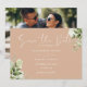 Este cartão de save-the-date de casamento floral verde botânico bege elegante pode ser personalizado com suas informações em tipografia chic com sua foto especial no verso. Projetado por Thisisnotme©