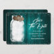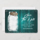 Casamento de teal russo salve o cartão de data com um jarro de mason com luzes de cordas e adornada com dois corações de burlap em um fundo de madeira de celeiro. Personalize facilmente este romântico casamento rústico e romântico de teal, salve a data online. Itens correspondentes disponíveis para complementar este casamento local salvem a data.