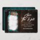 Casamento de teal russo salve o cartão de data com um jarro de mason com luzes de cordas e adornada com dois corações de burlap em um fundo de madeira de celeiro. Personalize facilmente este romântico casamento rústico e romântico de teal, salve a data online. Itens correspondentes disponíveis para complementar este casamento local salvem a data.