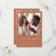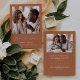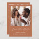 Este simples e minimalista Cartão Salvar a Data contém uma foto quadrada acima das palavras "Salvar a Data" em um guião elegante de escrita manual, seguido pelos nomes do casal, data do casamento e cidade em sans serif em um fundo de terracota. Adicione uma segunda foto horizontal e uma mensagem mais detalhada com informações adicionais sobre o contrário.