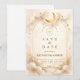 A refined celestial design featuring delicate crescent moons, scattered constellation stars, and a warm parchment-toned background. A thin gold border frames the layout, while elegant typography creates a timeless, sophisticated composition. The subtle vintage texture and balanced spacing give this piece a romantic, storybook feel without overwhelming the details. Perfect for couples who love classic elegance with a soft cosmic touch.