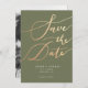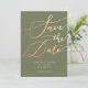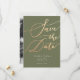 Casamento elegante e simples guarde o cartão de data. O texto da tipografia manuscrita é dourado esbatido contra fundo verde-oliva.