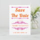 Vintage elementos e um casamento de tipografia laranja e rosa magenta salvem o anúncio da data. Este elegante design de casamento exibe o texto "Salvar a data" em negrito tipografia e elementos de vintagem que formam quadros para o texto. A parte de trás apresenta uma foto do casal.