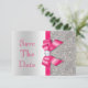 Cartões personalizados de Save The Date para casamento. Elegantes cartões de notas formais cor-de-rosa quente e prata personalizados, planos, duplos-faces, com um lindo padrão brilhante de lantejoulas glitter impressas, laços e fitas vetoriais brilhantes impressos e uma imagem estilosa e bonita de diamantes brilhantes e joias e um texto cor-de-rosa quente groovy num fundo gradiente prateado. Estes cartões de notas formais, glamorosos, da moda, cor-de-rosa quente e prata, são decorados em ambos os lados e impressos no papel de convite de sua escolha. Cartões duplos-faces bonitos, chiques, modernos, com brilho e glamour femininos. Por favor, note: Todos os convites na Zazzle têm imagens impressas planas. Tenho produtos combinando para casamentos na minha loja. O texto, a fonte e as cores da fonte são todos personalizáveis para atender às suas necessidades. Se precisar de ajuda para personal