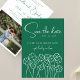 A frente deste cartão chique apresenta a adorável cor verde esmeralda e o texto "Salve a data" em caligrafia moderna manuscrita com um lindo ramo de trevos de quatro folhas selvagens, em branco. O verso inclui as informações simples, os nomes do casal, uma data e sua foto de noivado favorita. Este cartão é facilmente personalizado através do botão "Personalizar". Sinta-se à vontade para me enviar uma mensagem com quaisquer perguntas e pedidos personalizados, ficarei feliz em ajudar! Por favor, note que não posso modificar ou interferir em um pedido existente. Navegue pela minha Coleção de Casamento Verde Esmeralda para mais convites e outros produtos correspondentes, como convites, carimbos de borracha, cartões de RSVP e muito mais!