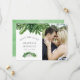 Moderno cartão de salvar a data de casamento com folhas tropicais aquareladas em tons de sage e branco e magnólias brancas.