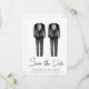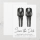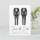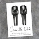 Anúncio de casamento gay elegante e sofisticado sem foto com dois tuxedos em aquarela e "Save the Date" em uma fonte estilosa. Adicione seus nomes, data e local do casamento em tipografia moderna.