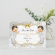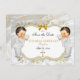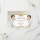 Lindos garotos gêmeos em seu terno batizante com colar de cruz de ouro e chapéu embelezado de ouro. O fundo é o cetim branco, o filigre dourado, uma moldura dourada e prateada e um embelezamento do arco. A parte de trás é enfeitada com o padrão de flor dourada em um fundo branco de cetim.