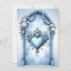 Um arco azul-claro-ornamentado com sotaques florais, um emblema cardíaco e rosas. Descubra uma galeria elegante com duas colunas com um topo saltado, ricamente enfeitado com entalhes intrincados e um emblema central em forma de coração. As rosas brancas com matizes de pêssego, folhas delicadas, e pequenas flores brancas moldam o portal incrivelmente desenhado. Ideal para apresentações de empresas ou produtos, casamentos ou designs de eventos que combinam romance clássico com esquemas de cores modernos.