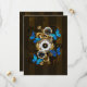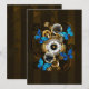 Composição do relógio de aço redondo com discagem numérica romana preta, decorado com engrenagens de ouro e latão, borboletas morfo azuis e lentes danificadas sobre fundo listrado castanho. Estilo Steampunk.