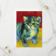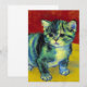 Cartão com um gato de mesa no estilo de Van Gogh! Este doce gatinho se posiciona adoravelmente num chão de madeira contra paredes vermelhas e uma janela. Um presente incrível para amantes de gatos e colecionadores de arte holandeses!