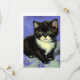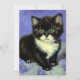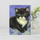 Cartão com um gatinho de smoking no estilo de Vincent van Gogh! Este gatinho bonito se posiciona com flores roxas. Um presente magnífico para amantes de gatos e colecionadores de arte holandeses!