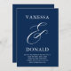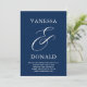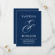 Casamento moderno salve o cartão de data apresentando um layout simples e mínimo com seus nomes e um computador elegante em um formato grande acima dos detalhes do evento. O tema de cor é azul marinho e pode ser alterado na ferramenta de edição design.