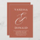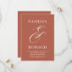 Casamento moderno salve o cartão de data apresentando um layout simples e mínimo com seus nomes e um computador elegante em um formato grande acima dos detalhes do evento. O tema de cores é terracotta e pode ser alterado na ferramenta de edição de design.