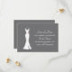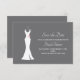 Um conjunto de cartão plano para salvar a data em um fundo cinza sofisticado. Projetado com um vestido branco elegante pendurado em um cabide. Design minimalista simples.