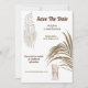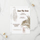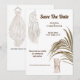 Duas cadeiras de madeira cobertas com chiffon macio amarrado na parte de trás são enquadradas por uma única folha grande. Um lindo sonho branco com renda trançada e longas penas penduradas aparece no canto superior esquerdo e modelos de texto para os detalhes do seu próximo casamento aparecem entre as ilustrações elegantes. Um lindo vestido de noiva longo e fluído pendurado num cabide aparece na parte de trás. Esses convites minimalistas e luxuosos são ideais para celebrações de casamento com tema de praia, verão, safári africano, selva, ao ar livre e floresta.