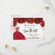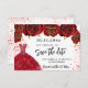 Uma garota e moda Salve o cartão de data para uma Quinceañera, 15 festa de aniversário. Rosas vermelhas decoradas em fundo branco, brilhos dourados falsos e um vestido vermelho. Personalize e adicione uma data e nome/idade. O texto: Salvar a Data é gravado com um script de estilo com letra de tendência grande.