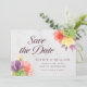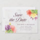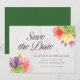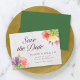 Este elegante cartão de "salve a data" floral apresenta flores vibrantes com as palavras "salve a data" em uma fonte moderna, tudo contra um fundo de mármore pálido na frente e um verso de cor verde.