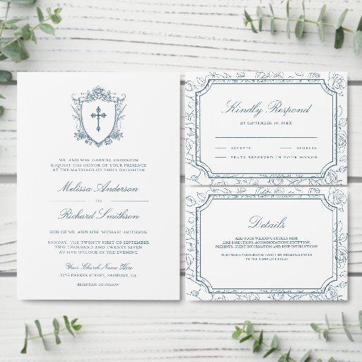 Amaze your guests with this elegant catholic wedding save the date featuring beautiful victorian crest with intricate details. Simply add your event details on this easy-to-use template to make it a one-of-a-kind save the date card.