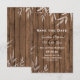 Este anúncio de casamento Save the Date apresenta uma bela sobreposição de vimeira sobre um fundo de madeira falsa rústica em tons de marrom e branco. ^