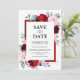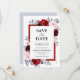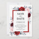 Cartão de salvar a data do casamento floral temático de ardósia rosa empoeirado vinho tinto, apresentando um buquê elegante de vinho tinto, vinho, azul empoeirado, rosado, rosas e botões de flores de peônia e folhas de eucalipto verde empoeirado e moldura geométrica prateada falsa vermelha. Por favor, entre em contato comigo para qualquer ajuda na personalização ou se você precisar de qualquer outro produto com este design