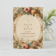 Um design elegante, enquadrado por ornamentado barroco, floresce e lança rosas em branco suave, pêssego e tons de ouro. O antigo pergaminho e os detalhes pareados criam uma atmosfera eterno e romântica, perfeita para uma celebração clássica inspirada em conto de fadas.