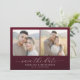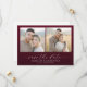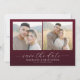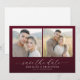 This wedding save the date card features a split composition with two portrait-oriented photo placeholders, set against a rich maroon background. The design includes elegant script typography for "save the date," followed by customizable names and event details in a clean serif font, creating a sophisticated yet intimate feel. The layout is balanced with ample negative space, enhancing focus on the central text and images. Perfect for couples looking to announce their upcoming nuptials with warmth and style, this card captures the anticipation of a special celebration.