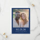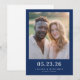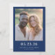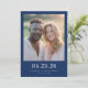 This wedding save the date features a minimalist yet elegant design with a central photo placeholder of two individuals, framed by a solid navy blue border. The layout is balanced and symmetrical, with customizable text in bold serif fonts at the bottom for the date, names, and location. The color palette includes natural skin tones contrasted against crisp white clothing, set against the deep navy background, creating a warm and inviting atmosphere. The overall style is realistic and serene, perfect for celebrating an intimate and significant event.