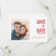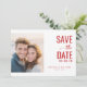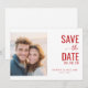 This wedding save the date card features a split layout with a soft-focused photo on one side, capturing an intimate moment between two individuals in warm, sunset tones. The right side showcases bold, modern typography in deep red hues, highlighting key details like "SAVE THE DATE" and customizable names and location. The design blends realism with elegance, using clean lines and negative space for a balanced, inviting look that sets the tone for a memorable celebration. Perfect for couples seeking a sophisticated yet personal touch for their big day announcement.