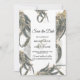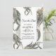 Um belo cartão de data com folhas de eucalipto de cor aquática rústica, verde-safra. Um design elegante ideal para qualquer tema de casamento. O reverso do cartão mostra um monograma minimalista. Os convites de casamento e outros artigos de papelaria também estão disponíveis.