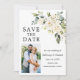 Watercolor Ivory White Floral Greenery Noivado de Casamento Salva o Cartão de Data inclui rosas brancas de marfim e verde botânico. Foto do casal.
