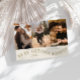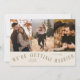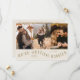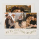 Elegant and modern save the date card featuring a text on a curved path that says "we're getting married." 3 photos on the front and one on the back. The background is cream.