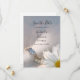 O bonito Casamento de margarida branca Salve o Anúncio de data cria um talento de classe para a sua próxima cerimônia de casamento. Este clássico casamento florescente mantém o anúncio da data com uma fotografia floral de uma flor margarida branca, anel de noivado de diamante e conjunto de bandas de casamento com um colar de pérolas branco e um fundo de cinzas leves.
