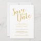 White Script Modern e Dourado Wedding Invitation Suite: Salve a Cartão de Data com título em fonte de script moderno dourado com detalhes de casamento em fonte de sans serif dourada e em fundo branco. Nota: Os detalhes da folha são simulados no trabalho de arte. Não será utilizada nenhuma folha de alumínio real no fazer deste produto.