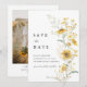 A romantic yellow sunflower and wildflower photo save the date card featuring soft watercolor florals and an elegant botanical layout. The delicate golden yellow blooms frame a warm engagement photo beautifully, creating a timeless garden-inspired design.