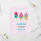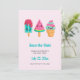 Salve a placa de data com uma ilustração de 3 tratamentos de sorvete diferentes. Um picolé azul-esverdeado com gotas de morango e salpicadores coloridos. Um picolé de melancia. Um cone com camadas deliciosas de sorvete em rosa e menta. Todos com sorrisos kawaii fofos.