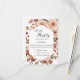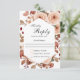 Um cartão de resposta de casamento com um design de fantasia boho floral em aquarela, verdadeiramente lindo, com uma paleta de cores neutras suntuosas em bege, verde, pêssego e toques de rosa e terracota. Uma moldura arqueada e elegante com sotaque dourado adiciona sofisticação ao design. A parte de trás do cartão apresenta um padrão floral correspondente encantador, com elementos florais distribuídos pelo design. Personalize com a data de resposta necessária.