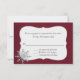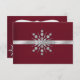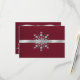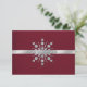 Linda resposta de cartão de RSVP de casamento de inverno, feito em um fundo borgonha. Lindos flocos de neve em tom de prata cristalizada decoram a frente e o verso do cartão. Uma área de texto decorativa branca com borda prateada, tem texto preto personalizado pronto para personalizar. Produtos correspondentes disponíveis.