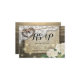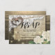 Modelos de Cartões de Resposta de Casamento em Estilo Rústico Country - Casal de Antiga Ferradura de Coração com Nó de Cordão e Renda Branca, Flor de Hortênsia, Luzes de Corda e Tecido de Sarja em Fundo de Madeira de Celeiro Antigo.