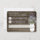 Cartão-resposta de lavanda e respirar fundo para complementar nosso conjunto de convites de casamento. Celeiro rústico do país de madeira e jarra de conserva cheia de flores de lavanda e respirar fundo.