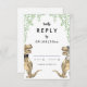 O tema do Dinossauro convite para casamento RSVP resposta cartão com noiva e noiva engraçada de dinossauro com verde botânico de cor d'água para trazer alegria Jurássica pré-histórica para o dia do seu casamento. Caligrafia tipográfica branca moderna com fácil personalização de modelos. Noiva T-Rex exclusiva e noiva em matizes verdes de folhagem castanha e eucalipto. Arte original da artista Catherine Sweetman Ideal para a recepção do dia do casamento ou janto de ensaio. A suíte de casamento combinando inclui tudo o que você precisará na sua divertida viagem de casamento