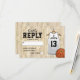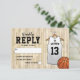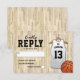 Cartões de resposta de festa de bar mitzvah com um fundo de quadra de basquetebol, uma camiseta branca com o nome da criança, número, a estrela de davi, e um modelo de resposta que é fácil de personalizar.