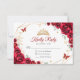 Cartão de resposta vermelho, dourado e floral branco Quinceanera RSVP. Recursos, fontes de script, borboletas douradas, rosas de aquarela e tiara. Perfeito para uma elegante celebração de glam estilo princesa. Personalize com seus próprios detalhes.