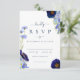 Elegante cor de água floral de verão com flores silvestres, cartão de resposta rsvp de casamento azul perfeito para um casamento de primavera ou verão. Com um belo roteiro romântico elegante de tipografia para personalizar com a data de resposta do casamento e as informações de presença usando modelos fáceis de usar. Flores silvestres únicas, incluindo flores de milho, papoilas, cosmos e me esqueçam de nãos com delicada mão de folhagem pintada pela artista Catherine Sweetman em azul de córnea, azul empoeirado, azul esbranquiçado, azul marinho, roxo e verde. Ideal para o jardim botânico, primavera ou casamento de verão. Encontre itens correspondentes na elegante suíte de casamento floral azul de verão