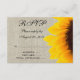 Cartões de RSVP de Casamento Rústico com Girassol Amarelo com uma foto ousada de um girassol em um efeito de foto em linho bege. Uma escolha linda para o cartão de resposta do convite de casamento se você está tendo um casamento no campo, casamento com tema de aniagem ou um casamento de outono. Totalmente personalizável, incluindo sua escolha de fontes vintage rústicas usando o menu de edição. Adicione suas informações pessoais e escolha sua paleta de cores, incluindo muitas opções de papel encantadoras. Precisa de ajuda para personalizar seu pacote de casamento? Por favor, entre em contato com luxuryweddinginvitations@gmail.com